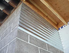Two photos of the corrugated metal sheets in place under the roof eves. Once the