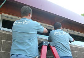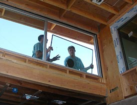 07.01.04 The Jackson Glass crew arrives to install the "raked" windows into their