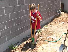 Quinn is attempting to dig a fence post hole.