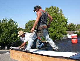 rolling out the tar paper on the garage roof deck.