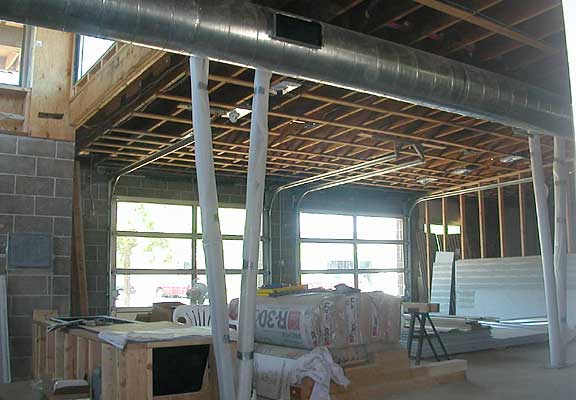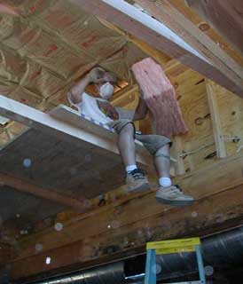 07.13.04 The first section of ceiling insulation is installed in preparation for the