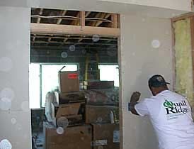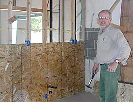 Don Sr. installs OSB sheets on the kitchen wall. This will add support for cabinets