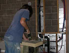 Julian cuts foam insulation board to install into the master bath chase wall behind