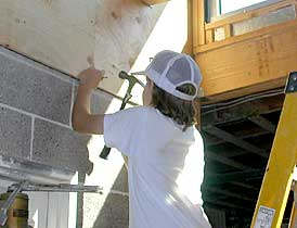 07.15.04 Julian hammers in nails on a final piece of plywood above the front doors.