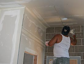 Alphonzo puts up a section of drywall in the kitchen. At right, the twin master bath